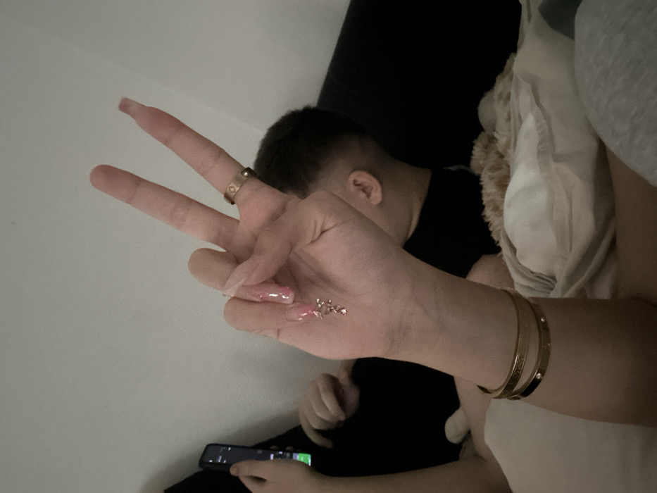 The image depicts an indoor scene featuring two individuals. In the foreground, a left hand, likely female, is raised in a V-sign, extending the index and middle fingers. This hand exhibits long, clear-pink manicured nails, with the ring finger nail adorned by small, reflective, dangling charms. A gold-colored band ring with a patterned design is present on the index finger, and two plain, gold-colored bangles are worn on the wrist. In the background, partially visible to the right, is the head and upper torso of a second individual, displaying short, dark hair and wearing a black garment. To the left, another hand, likely belonging to the second individual, holds a dark-colored smartphone with a glowing green element visible on its screen. The immediate environment includes a plain light-colored wall in the background, dark upholstered furniture (possibly a couch or bed headboard), and light-colored, rumpled bedding or fabric in the lower right. The specific location within Strasbourg, France, cannot be determined from the visual information provided.
