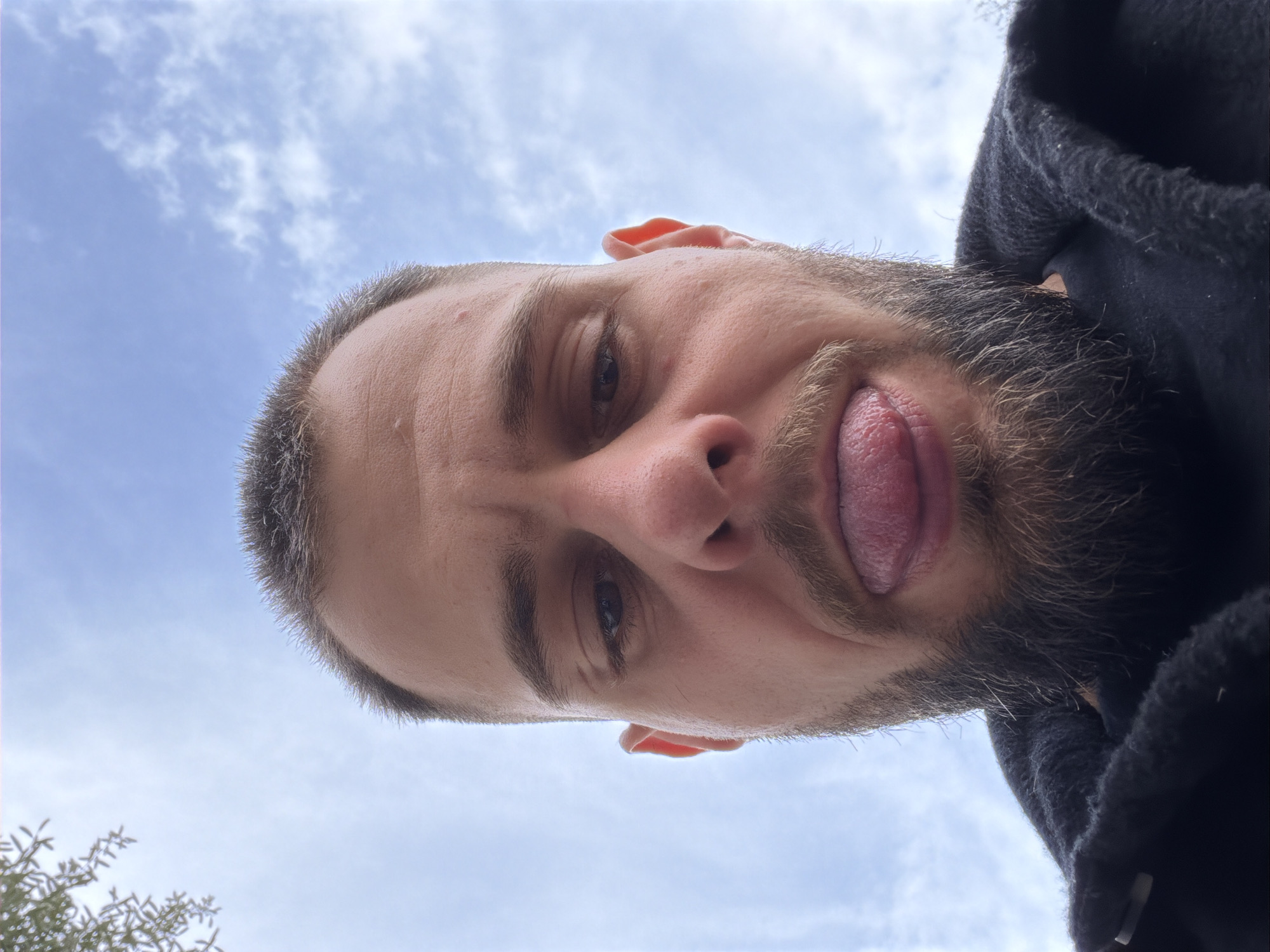 A low-angle, head-and-shoulders portrait captures a male individual with short dark hair and a beard, directly facing the camera with his tongue extended