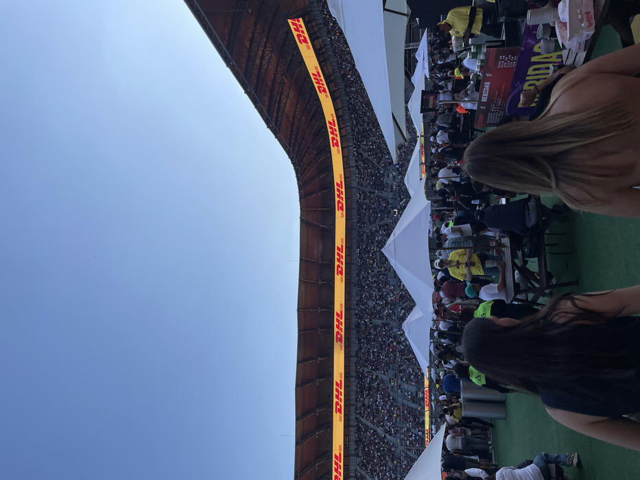This image captures a crowded outdoor event on a green surface, likely artificial turf, within a large stadium in Mexico City, Mexico. The stadium's upper tiers, filled with numerous spectators, are visible under a clear blue sky. A continuous LED ribbon board displaying the yellow "DHL" logo repeatedly encircles the stadium below the upper seating deck. In the midground, a multitude of white square canopy tents are erected, forming concession or vendor areas. A dense crowd of people is circulating among these tents, standing, and conversing. Several wooden picnic tables are present, some occupied by individuals consuming food and beverages. A visible concession stand on the right features a red sign indicating "BEBIDAS" (drinks), listing "CERVEZA" (beer) with prices, and another sign for "HAMBURGUESAS" (hamburgers). Event staff, identifiable by yellow shirts, are present throughout the area. In the immediate foreground, the backs of two individuals are visible, walking away from the camera. The person on the left has long, dark hair and wears a dark sleeveless top. The person on the right has long, light brown hair and appears to be wearing a light-colored or strapless garment that exposes their back. The scene depicts a large-scale public gathering with commercial sponsorship and extensive attendee amenities.