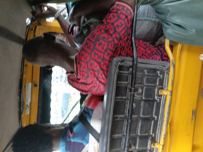 The image captures the interior of a yellow tricycle (keke napep) in the city of Ado, Nigeria, looking forward from the rear passenger area