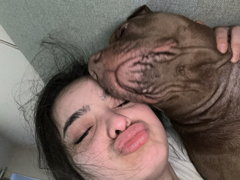 The scene is an indoor setting in Malevo, Bulgaria. It features a close-up depiction of a female individual and a medium-sized brown dog in intimate contact. The female, positioned on the left side of the frame, has dark hair and closed eyes. Her lips are pursed into a distinct pouting or kissing gesture. Her left hand is partially visible, appearing to cradle or support the dog's chin or neck. The dog, consistent with a Pit Bull or similar breed, has solid brown fur and is positioned against the female's face, with its head tilted upwards and to the right, causing wrinkles in its facial skin. Both subjects are leaning into each other. The background consists of a light green or teal upholstered surface, indicative of a couch or bed within a domestic environment.
