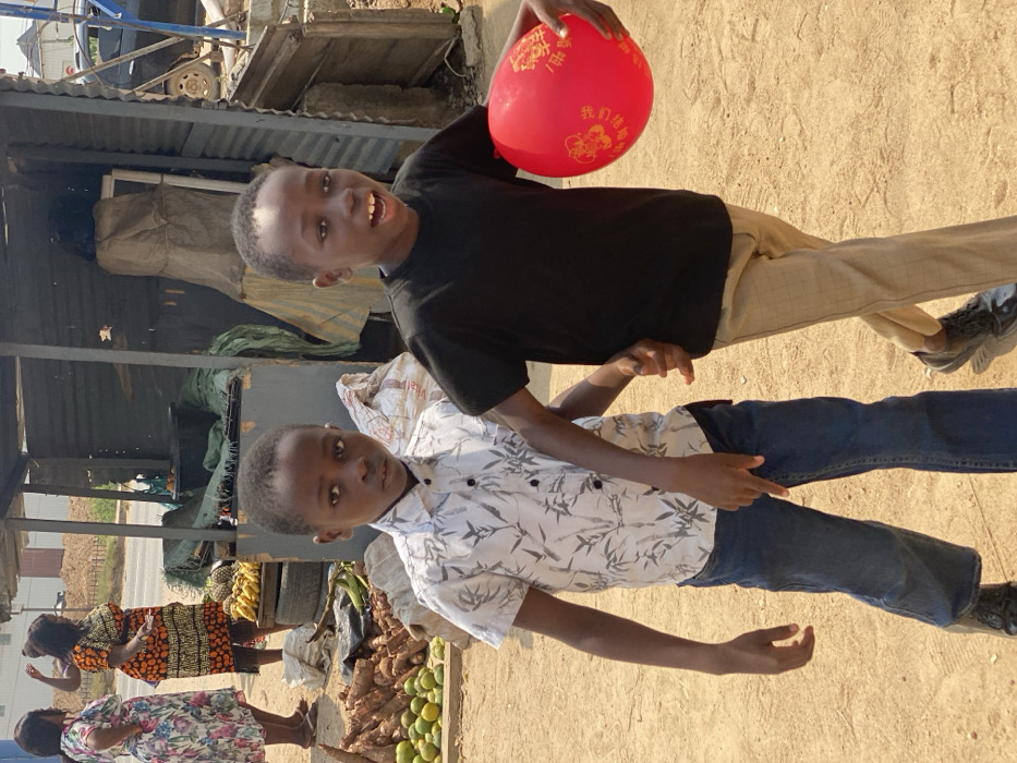 The scene depicts an outdoor roadside market in Gbawe, Ghana, under bright daylight conditions. In the foreground, two juvenile males are walking from left to right across unpaved, light-brown ground. The juvenile male on the left, positioned slightly forward, wears a white short-sleeved collared shirt with a dark, leaf-like pattern, and dark blue trousers with black shoes. He has short dark hair and looks directly at the viewer with a neutral expression. His right hand is loosely connected to the left hand of the second juvenile. The juvenile male on the right wears a black short-sleeved t-shirt, light brown checkered trousers, and dark athletic shoes. He has short dark hair and an open-mouthed expression, possibly speaking or exhaling. He holds a spherical red balloon with yellow text and a circular emblem in his right hand. His left hand is connected to the right hand of the first juvenile. In the midground to the left, a rudimentary market stall constructed from corrugated metal panels is visible. On and around the stall are various food items, including a pile of yellow bananas on an inverted tire, pineapples, large white tubers (possibly yams or cassava), and a cluster of green citrus fruits (limes or small oranges). A large white sack is also present near the ground. Further in the midground, three adult females are visible. The woman closest to the left wears a floral-patterned dress. The woman in the center wears an orange and black patterned dress. Another woman is partially visible behind her. They appear to be standing near a paved road, where a dark vehicle is partially visible on the far right. The background shows distant structures and possibly construction activity.