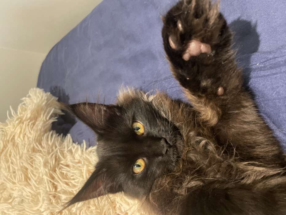 - "A long-haired cat, likely a Maine Coon, is depicted lying on its back in an indoor residential setting, specifically a bedroom, in the city of Unknown, Unknown" by FM-HSuMn2, licensed under CC BY 4.0