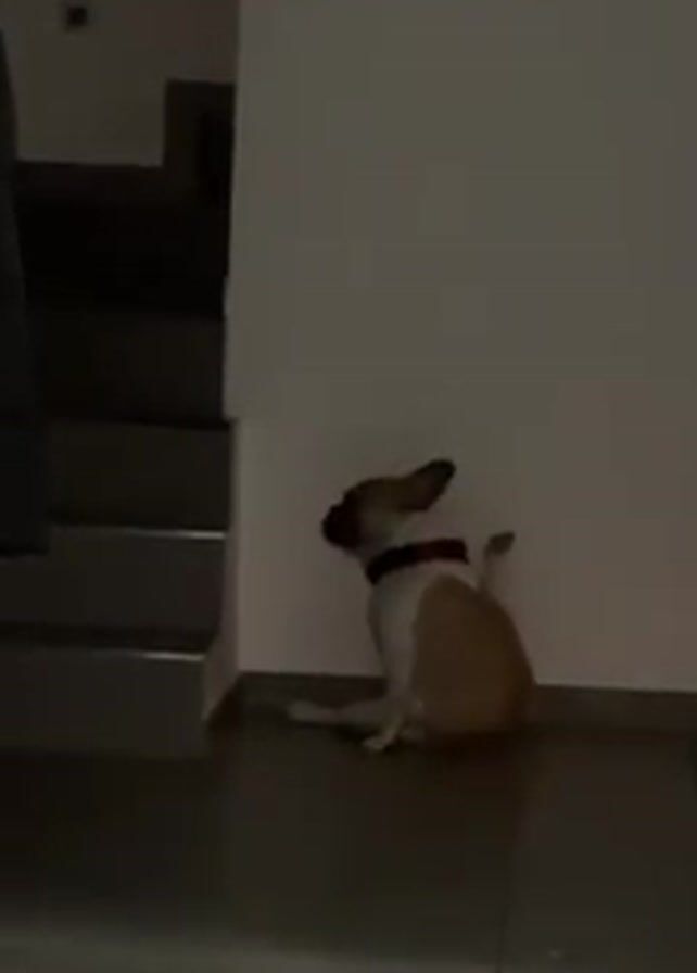 The video depicts a small, tan and white dog sitting on a gray tiled floor. The dog is positioned next to a white wall and a gray staircase. The dog has a dark collar with a red and white pattern. The lighting is dim, casting shadows in the scene. The dog sits with its back against the wall and appears to be looking upward or towards the left.
