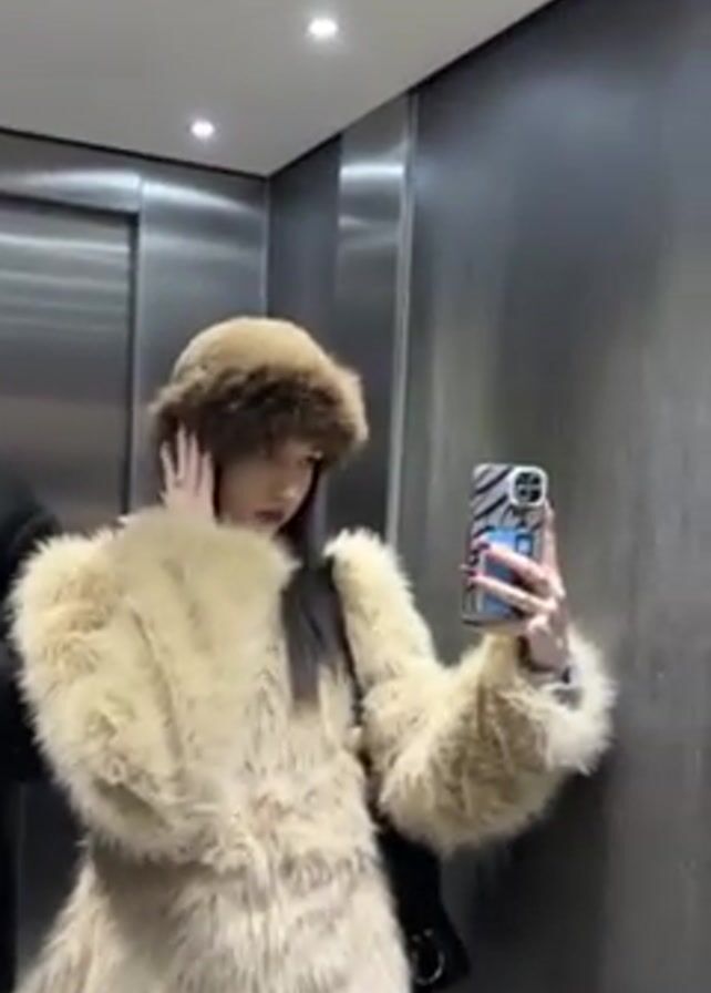 Two individuals are taking selfies in an elevator. The man is wearing a black turtleneck, black coat, and sunglasses, holding his phone up to take the picture. The woman is wearing a fur hat and a fur coat. She is also taking a selfie with her phone. The interior of the elevator is made of metal. There are papers posted on the wall. There are two ceiling lights visible.