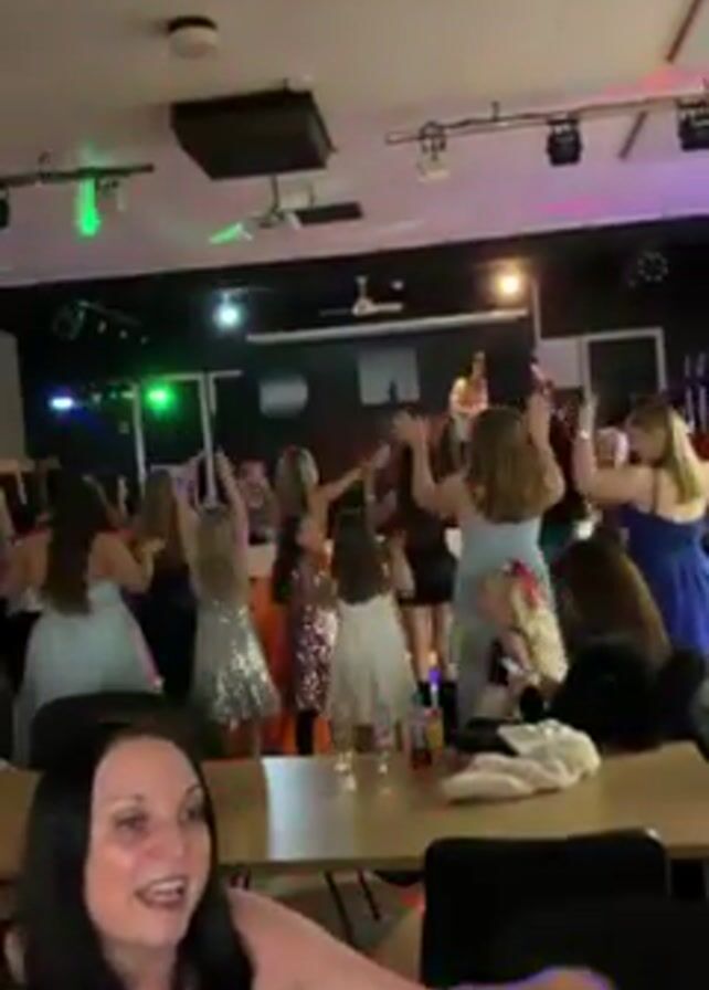 A woman in a zebra-print top is sitting at a table in a party venue. Behind her, a group of women in dresses are dancing, facing a stage where a man is standing. The room is decorated with party lights, including green and purple. There are tables with drinks and personal items around the room. The focus is on the dancing and party atmosphere.