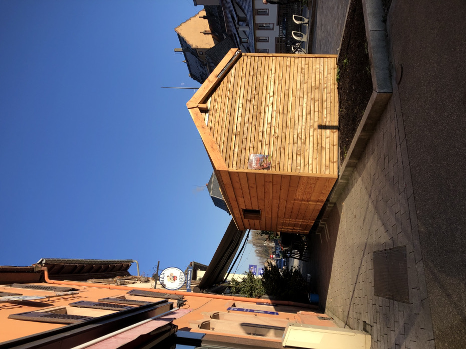 The image depicts an outdoor urban scene in Saverne, France, under a clear blue sky illuminated by low-angle sunlight. A prominent light-toned wooden structure, resembling a gabled shed or temporary stall, occupies the midground, positioned on a paved area to the right. This structure features horizontal planks, a small rectangular window on its left side, and a colorful poster affixed to its right facade. It sits adjacent to a low, rectangular planter box filled with dark soil. To the left, an orange-painted building with dark window frames displays a circular white sign reading "BAR BRASSERIE" with a stylized skull logo. A dark retractable awning extends from this building over an outdoor seating area partially obscured by green foliage, with a blue bucket visible beneath. A square metal utility cover is embedded in the foreground pavement. Further down the street, several vehicles are present. To the right of the wooden structure, beyond the planter, white bicycle racks are visible on a paved square, where a person in dark clothing is partially observed on the far right. In the background, residential buildings with varying rooflines and a faint dusting of white are visible, along with distinct dark, pyramidal roof structures. A pale crescent moon is faintly visible in the upper right sky. Long shadows extend across the grey brick pavement from left to right.