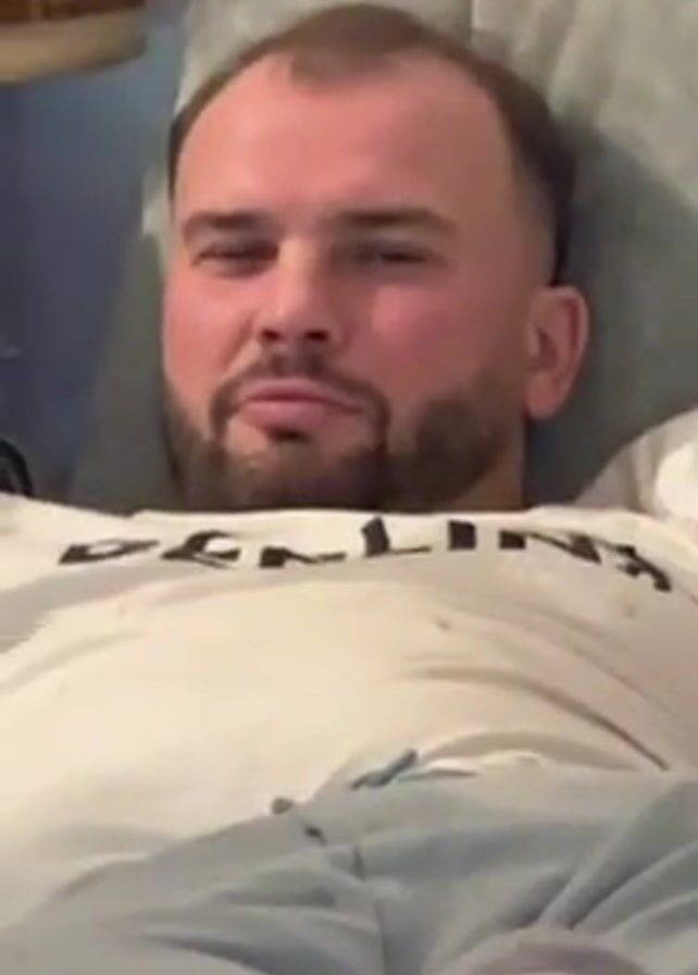 A fair-skinned man with a short haircut and a trimmed beard is lying down, looking at the camera. He is wearing a white t-shirt with the word "BERLIN" printed on it. The man raises his right hand and places it on his forehead. He is lying on a light blue surface, likely a couch or bed. In the background, there is a blurred object, potentially furniture. The lighting is somewhat dim, but the man's face is well-lit. The camera is close to the man, and the shot is slightly shaky.