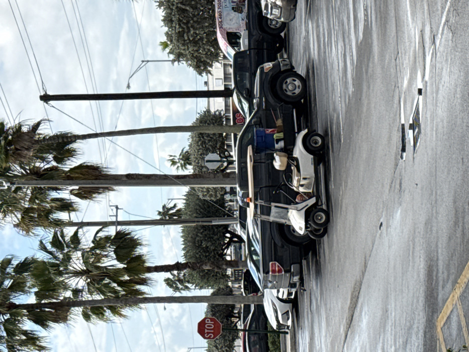 - "A row of parked vehicles, including a box truck, several pickup trucks, and a golf cart, line a street with palm trees and utility poles" by FM-rSR2K3, licensed under CC BY 4.0