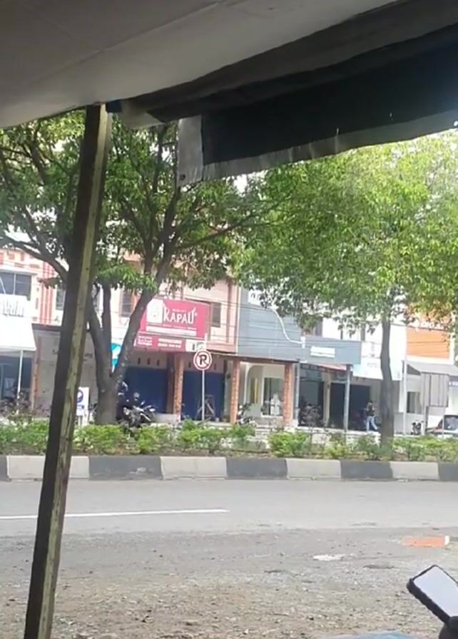 view of a street scene from under a canopy. The street has a center divider of bushes, with buildings on the opposite side. Vehicles including a black car, a motorcycle ridden by a person in a headscarf, and a white car pass on the street. A hand holding a mobile phone is visible in the lower right corner of the frame. There is also a decorated table in the foreground.