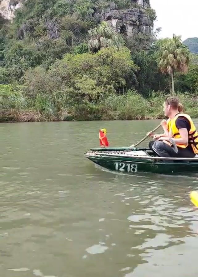 small boat traveling on a river against a background of lush green vegetation and a rocky cliff. A person in a yellow life vest is paddling the boat with a long oar. Two other people sit in the back of the boat. The boat is dark green and has the number "1218" painted on the side. A small red Vietnamese flag is attached to the front of the boat. The river is a murky green color, and the vegetation on the riverbank is dense. The cliff is covered in trees and other greenery, and the sky is overcast.