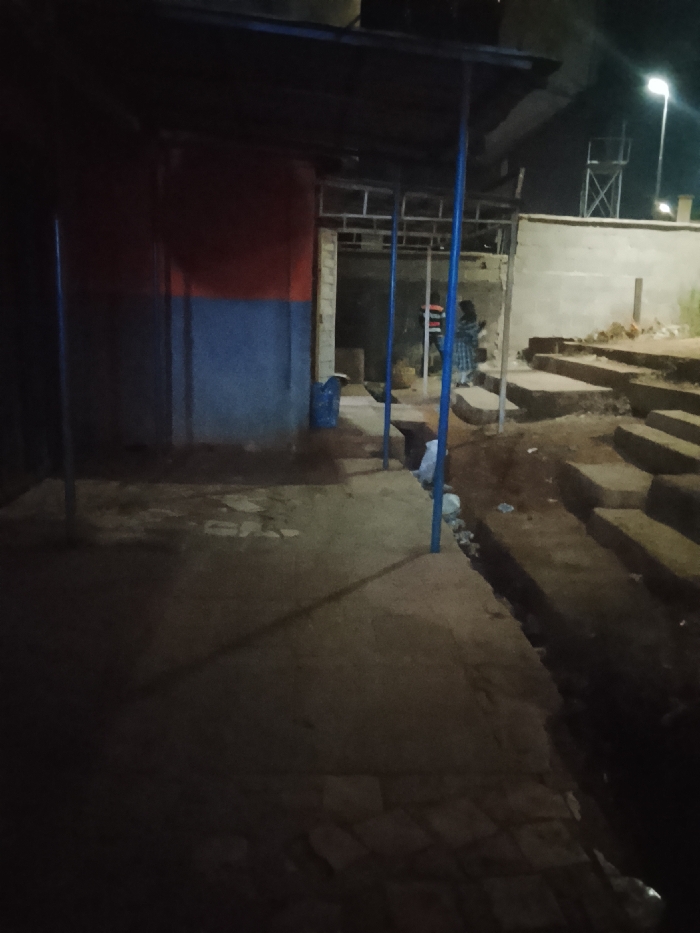 A dim outdoor space at night, partially covered by a low-roofed structure supported by blue posts. A building painted red and blue is to the left, next to an entranceway. Beyond the entrance, two figures stand. To the right, concrete steps ascend beside a white wall. A streetlamp illuminates the scene in the background. The ground is dirt and concrete, with a small ditch running along the edge of the steps.