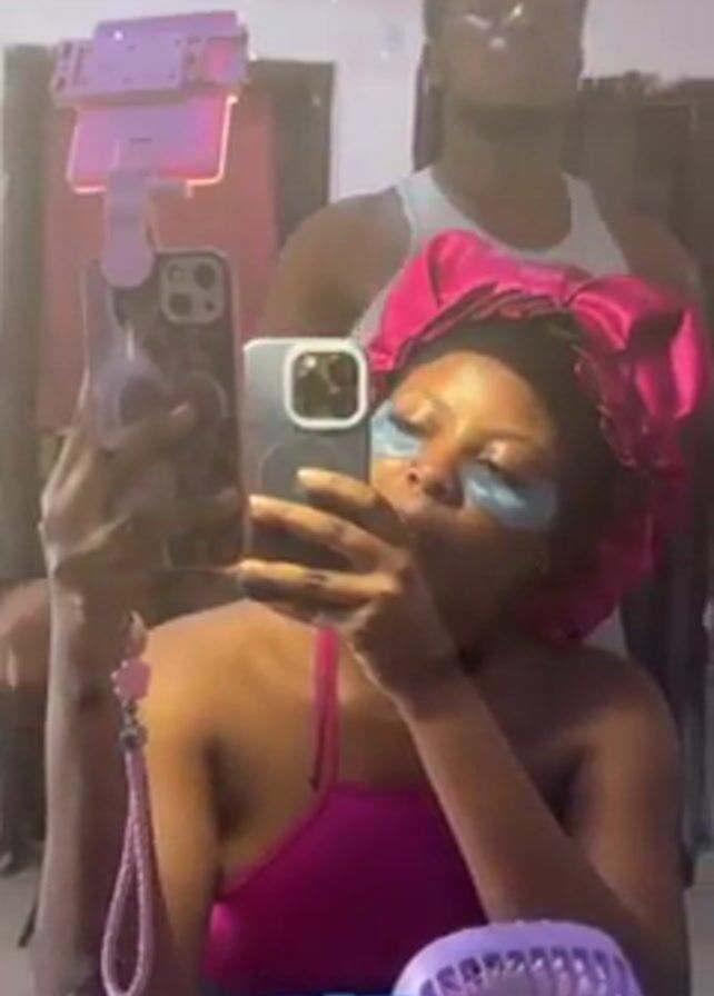 A young woman is taking a mirror selfie in what appears to be a bathroom. She is wearing a pink satin bonnet, under-eye patches, and a pink top. She is holding her smartphone in one hand, and a second phone is being held by a pink phone holder in front of her. Behind her, a young man in a white tank top is brushing his hair while looking down, seemingly disinterested in the selfie. A package of baby wipes and a purple hairbrush sit on the counter in front of the woman. There are string lights visible in the reflection.