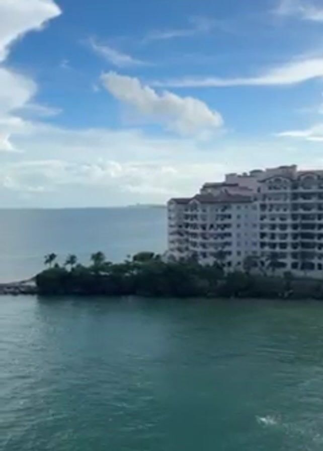 The video presents an elevated shot of a waterfront scene. The sky above is bright blue with scattered white clouds. The ocean appears teal and still, with some minor wave action visible on the water's surface. Adjacent to the water is a small island or peninsula covered in lush green trees. Situated on the island is a tall white building with a red tile roof, multiple stories, and several balconies visible on its facade. The building is a large residential structure, possibly an apartment complex or resort. In the distance, across the water, is a faint, hazy view of what appears to be a shoreline or cityscape. The video captures a tranquil coastal setting on a clear day.