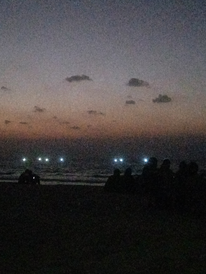 The image displays a twilight or nighttime scene on a beach in Al-Mawasi, Palestinian Territories