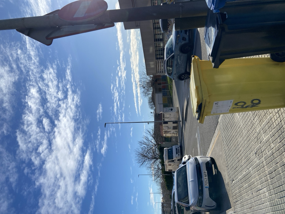 A street scene under a blue sky with wispy clouds. A no entry sign is visible at the top left. Cars are parked along the side of the road, with a white vehicle prominent in the foreground displaying license plate "7052 NFP". A truck is further down the street. Trash bins of yellow and blue are visible on the right side of the frame. Buildings can be seen in the background. The image is rotated counterclockwise.