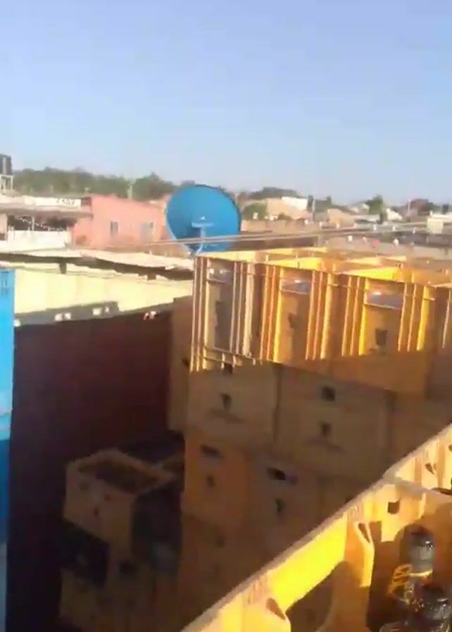 n outdoor storage area filled with crates of bottled beverages. The crates are stacked in piles and arranged in rows. Some of the crates are blue, yellow, brown, or wood-colored. The blue crates have the letters "NB" on them. The wooden crates say "GUINNESS". A man is seen standing near the crates, looking into the camera. The background shows buildings and a utility pole.