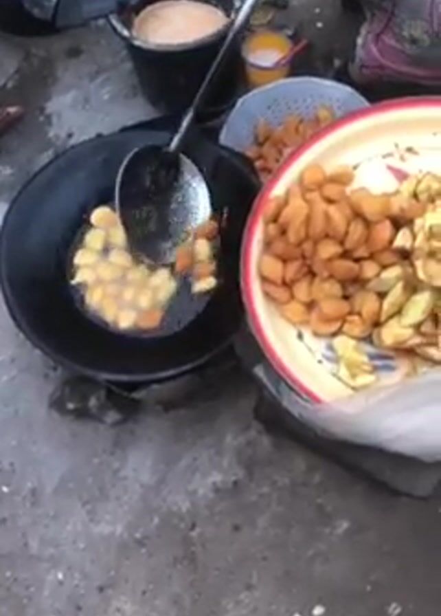 A person wearing a colorful patterned top stands outside frying food. A large black pan sits on the ground, filled with small, pale yellow pieces of food frying in oil. The person uses a slotted spoon to stir the food. A colorful plate next to the pan holds already fried food, a mix of golden brown and pale yellow. A black bucket filled with a doughy substance is visible in the background, along with a blue strainer containing more fried food. The ground is concrete.