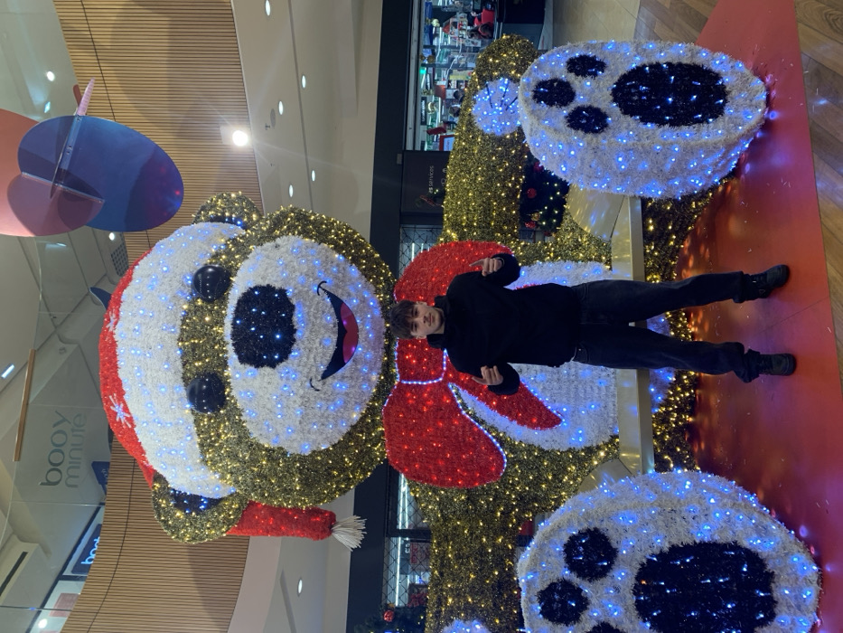 A young man stands in a shopping mall, posing next to a large Christmas decoration depicting a bear wearing a Santa hat and a red bow