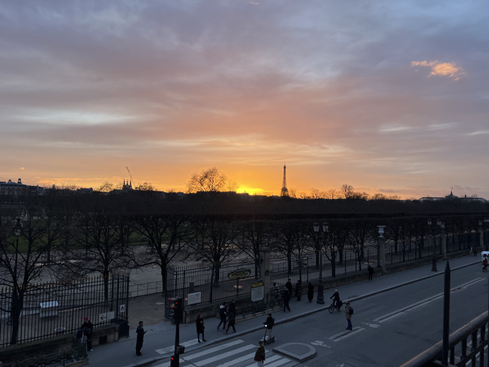 A vibrant sunset fills the Parisian sky, casting an orange glow behind the Eiffel Tower and silhouetting buildings on the horizon