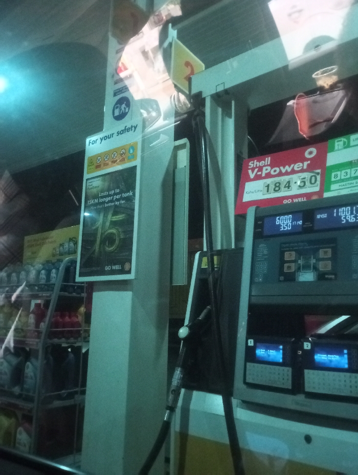 gas pump at a Shell station. The Shell V-Power gas price is 184.50 per liter. The pump displays a current total of 1100.17 with a volume of 59.63 liters. A safety sign informs customers they can get up to 15KM longer per tank. Other items are on a shelf in the background.