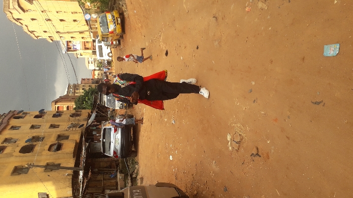 The scene depicts an unpaved, reddish-brown dirt road in Onitsha, Nigeria, under an overcast, dark grey sky. Multi-story, yellow-ochre colored buildings with visible balconies and weathering line both sides of the street. In the foreground, a dark-skinned male, approximately 20-30 years old, walks towards the viewer. He is dressed in black trousers, a black long-sleeved shirt, and white sneakers. He wears sunglasses and an over-garment featuring a red lining and a multi-colored (green, yellow, black, white) patterned collar/lapel. He holds a dark-colored mobile phone in his left hand. To the left, a silver SUV is parked on the unpaved shoulder adjacent to a makeshift market stall constructed with corrugated metal and wooden supports. A female figure in a patterned skirt and top stands near the SUV. A white panel van with "MIYA" text is partially visible on the far left. In the midground, a young child wearing a red and white striped shirt and blue shorts runs from right to left across the dirt road. Further down the street on the right, a white van and a yellow mini-bus are parked. A blue circular sign is affixed to the multi-story building on the right. The road surface exhibits unevenness, tire tracks, and scattered debris including plastic wrappers and small stones. Utility poles with numerous overhead wires are visible throughout the streetscape, connecting the buildings. More multi-story buildings are visible in the background, receding into the distance.