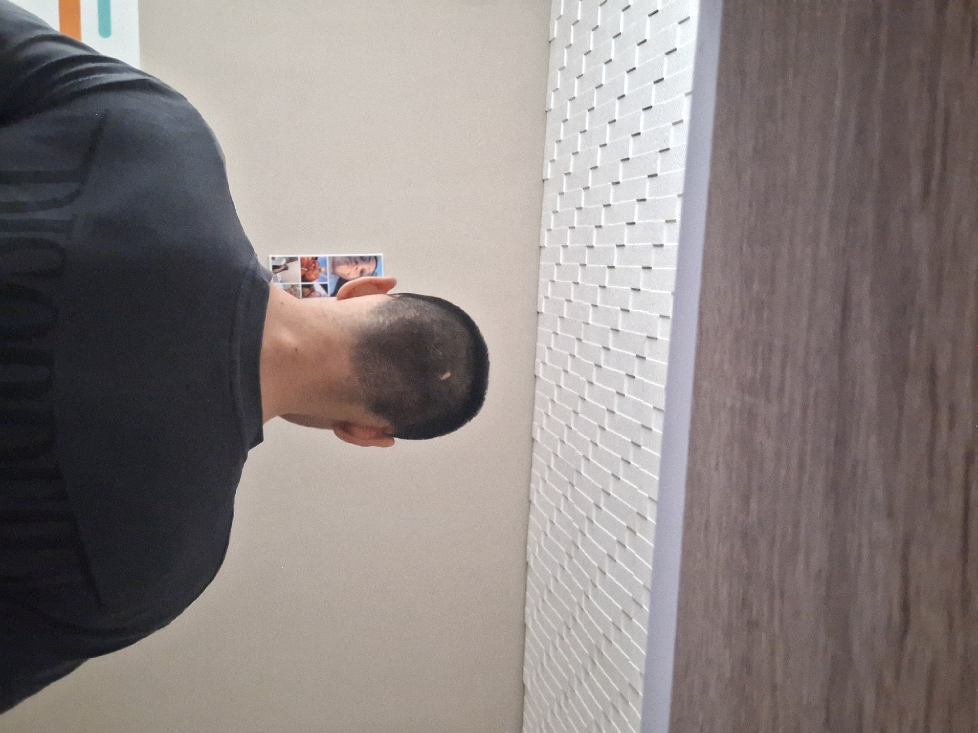 The image, taken in Enitsa, Bulgaria, displays a rear view of an adult male, visible from the upper back to the top of his head. The man has short, dark, buzzed hair, featuring a small, light-colored epidermal lesion on the crown. He is wearing a dark-colored, short-sleeved t-shirt with tonal text partially visible on the back, reading "DISCORD". The subject stands with his back to the viewer, facing a plain, light beige wall. Affixed to this wall, to the right of the man's head, is a grid of at least five small square photographs or printed images; one clearly depicts a human face. The bottom section of the image frame reveals a white ceiling characterized by a textured pattern of uniformly arranged, interlocking rectangular panels. The top section of the frame shows a mottled, brownish-grey surface, possibly wood or laminate. To the far left, a small section of a white object with horizontal turquoise and orange bands is partially visible.