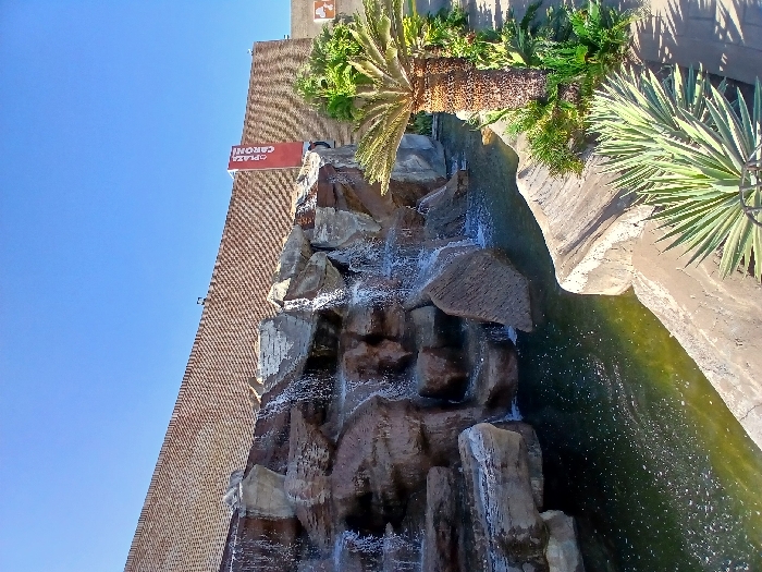 A vertical, slightly angled shot features a rocky waterfall cascading into a pond, lined with concrete and greenery. A brick building rises to the left, topped with a red "PLAZA CARONI" sign. Above the waterfall, a palm tree and other plants add to the scene. A clear blue sky fills the upper left of the frame.