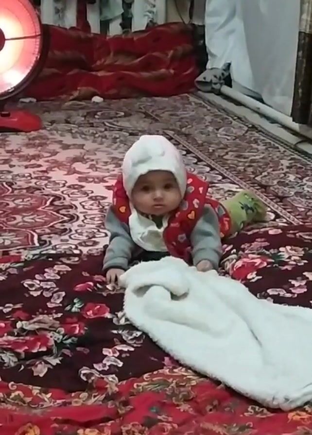 A close-up shot shows a baby dressed in a white hat and a red vest with white polka dots, lying on a patterned carpet with floral designs. The baby has a bib and is propped up on their elbows, looking towards the camera with a neutral expression. A white towel lies in front of the baby. In the background, there is a red heater on the left side of the frame, emitting a warm glow. A clothesline with baby clothes hanging on it is visible behind the baby, with bedding and curtains to the right. The carpet's design includes a mix of red, brown, and beige patterns. The overall lighting in the room is a bit dim, but the heater provides a focal point of brighter light.