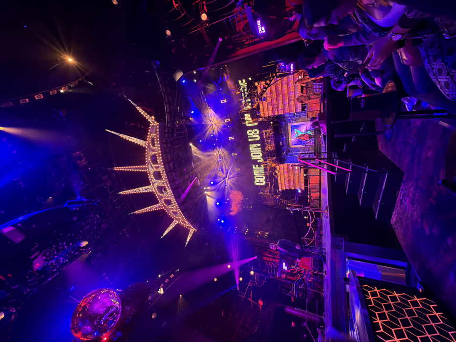 A vivid stage show captivates with vibrant colors and dynamic lighting. A luminous semi-circular structure, adorned with bulbs, hangs overhead. The stage's backdrop displays the words "COME JOIN US." Below, a scene unfolds, filled with stairs and platforms. The atmosphere is further enhanced by a disco ball and a crowd of seated onlookers in the balcony. The scene pulsates with a sense of excitement.