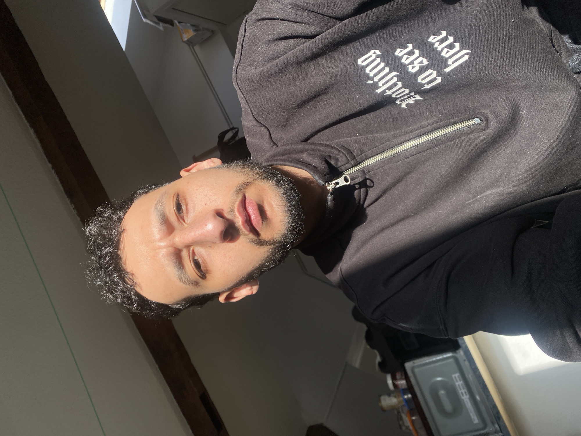 A selfie taken indoors, shows a light-skinned man with dark curly hair and a beard wearing a black hoodie with the inscription "Nothing to see here"