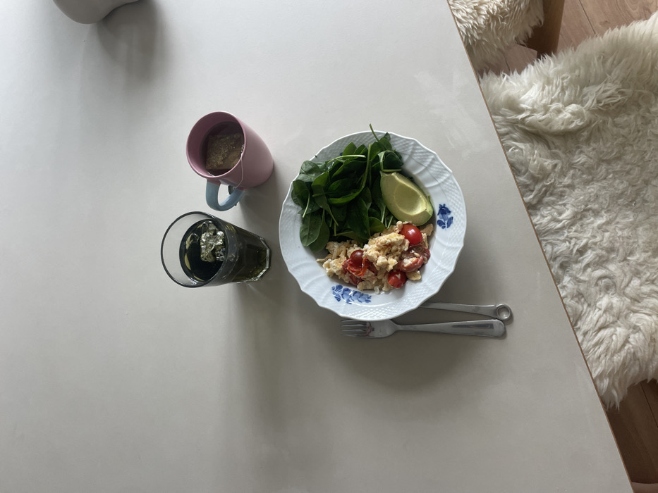 An overhead view depicts a prepared meal set on a light beige, glossy table surface in Copenhagen, Denmark. The central subject is a white plate with blue floral patterns, holding scrambled eggs mixed with halved cherry tomatoes, a side portion of fresh green spinach leaves, and a quarter of an avocado. To the left of the plate are two silver-colored forks. Above the plate, positioned slightly to the right, are two beverages: a clear faceted glass containing a dark liquid with two ice cubes, and a pink mug with a light blue handle, holding a dark liquid with a visible tea bag string. The lower right portion of the frame reveals a light wooden floor partially covered by a white, shaggy, sheepskin-like rug. No people are present.
