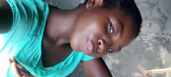 A young Black woman wearing a turquoise shirt gazes upwards with a slight smile. She has dark eyes, short braided hair, and a single stud earring. The photo is taken from a low angle. The background appears to be a concrete or painted surface with subtle variations in tone, and a wooden object is visible in the lower right corner.