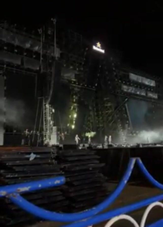 large outdoor concert stage at night. Performers can be seen on stage with fog and bright lights creating a dynamic atmosphere. The stage is adorned with massive speaker arrays and lighting rigs, displaying the Heineken logo prominently. A blue metal railing separates the camera from a stacked set of construction materials. The camera appears to be held by someone standing in a restricted area, looking out towards the stage.