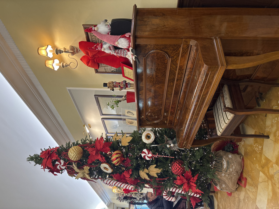 A decorated Christmas tree stands in front of a dark wooden piano. Ornaments include red poinsettias, gold spheres, and candy canes. On top of the piano are Christmas gnomes and a toy soldier, with framed pictures behind them. A piano stool is placed next to the piano. A man in a black jacket is partially visible near the base of the tree. A Christmas sack sits at the base of the tree.