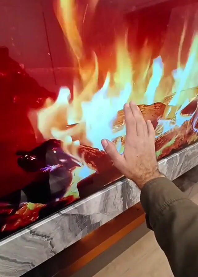 A person extends their hand toward a large, rectangular fireplace-like display. The display features a realistic animation of flames and burning logs, with a reddish-orange glow emanating from the "fire." The frame of the display is a light gray marble pattern, and there is an orange-toned strip beneath the marble. The person's hand is visible, and they are wearing a green jacket. The background is slightly out of focus, showing glimpses of a modern interior.