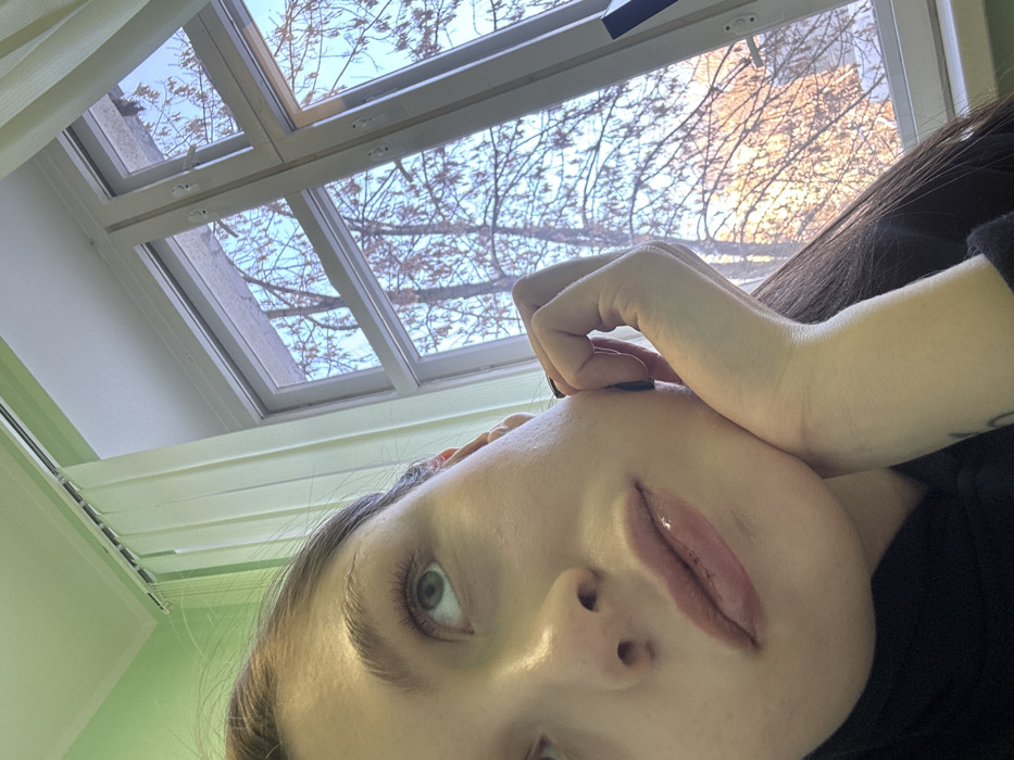 The scene is an interior view from Balashikha, Russia, featuring a young female observed from an upward angle. Her upper torso and head are visible, occupying the lower-left quadrant of the frame. She has light-colored eyes and gazes upward and to her left. Her lips are slightly parted and appear glossy. Her right hand, with black-painted fingernails, supports her right jawline. She wears a dark garment, likely a hoodie, and her dark hair is visible on the right. A faint marking is present on her right wrist. The background consists of a light green interior wall and a white multi-pane window frame. Light green vertical blinds are partially visible at the top-left, hanging from a track. Outside the window, under a clear, light blue sky, numerous bare deciduous trees with sparse, dried leaves are present, indicating an autumn or winter period. Distant foliage and a building structure, illuminated with a warm, golden light, are partially visible through the tree canopy.