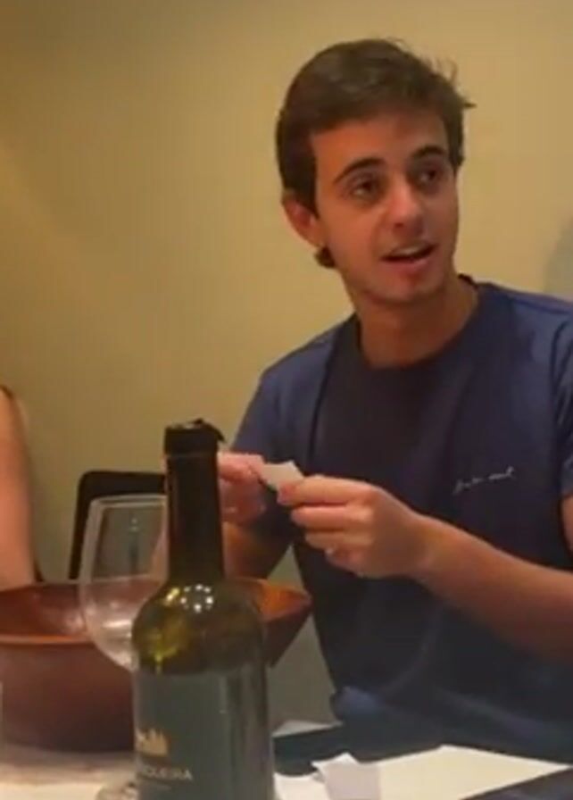 two individuals at a dining table. A young man is seated at the table, wearing a blue shirt and looking at a small piece of paper. He is holding the paper in both hands and looking at it with a smile. He appears to be reading something written on it. To his left, there is a green wine bottle, several wine glasses, and a bowl. A woman is seated across from the man, looking at her smartphone. The table is covered with a white tablecloth. The room has a neutral-colored wall.