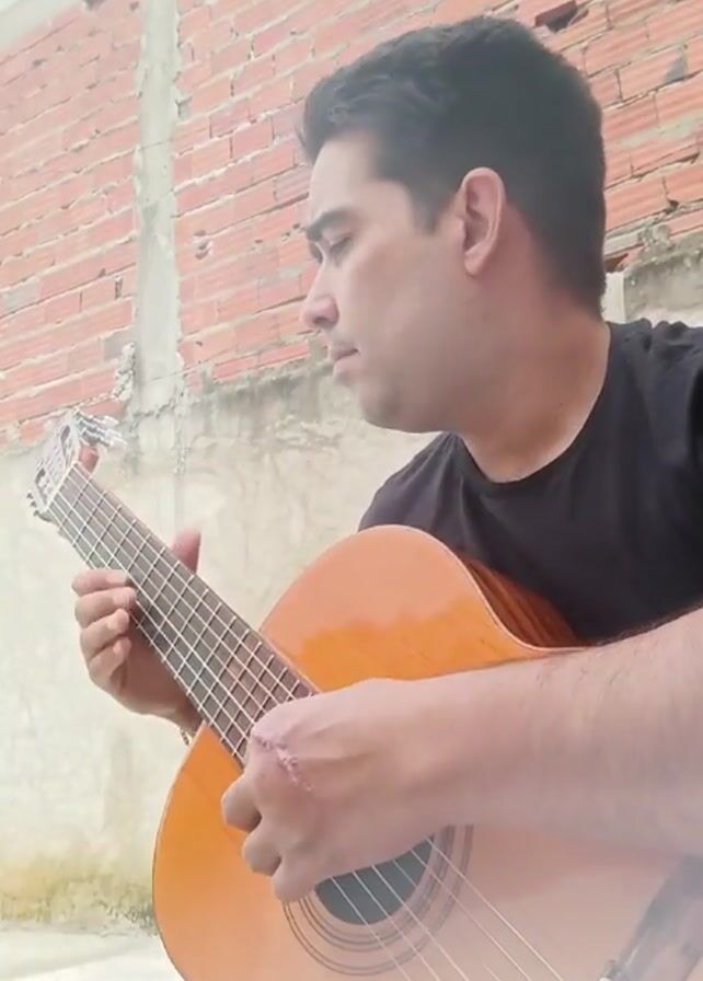 A man with short dark hair and a black t-shirt is shown in a medium shot playing an acoustic guitar. He is seated in front of a wall of red bricks and a section of textured concrete. He looks directly at the camera, then looks down at the guitar. He is holding the guitar in the typical manner. A prominent scar is visible on the back of his left hand.