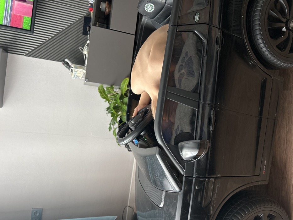 A person is inside a small, black Land Rover toy car
