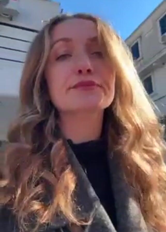 A woman with long, wavy, auburn hair, wearing a gray coat and a black turtleneck, stands outside on a sunny day, holding a camera and recording a video