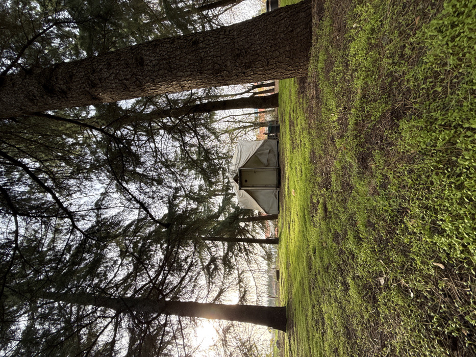 A small, temporary shelter with a white tarp stands on a grassy field bordered by tall pine trees. Sunlight filters through the branches, casting shadows across the scene. The ground cover appears lush and green. The shelter's construction is simple, potentially makeshift. It sits amongst the trees and vegetation, blending into the natural environment.