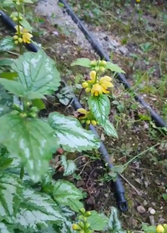 plant with green leaves and yellow flowers. A bee is seen landing on one of the flowers, presumably collecting nectar or pollen. The plant is growing in a garden or natural setting, with other plants and vegetation visible in the background. Black irrigation tubing snakes through the undergrowth. The lighting suggests the video was taken during the daytime.