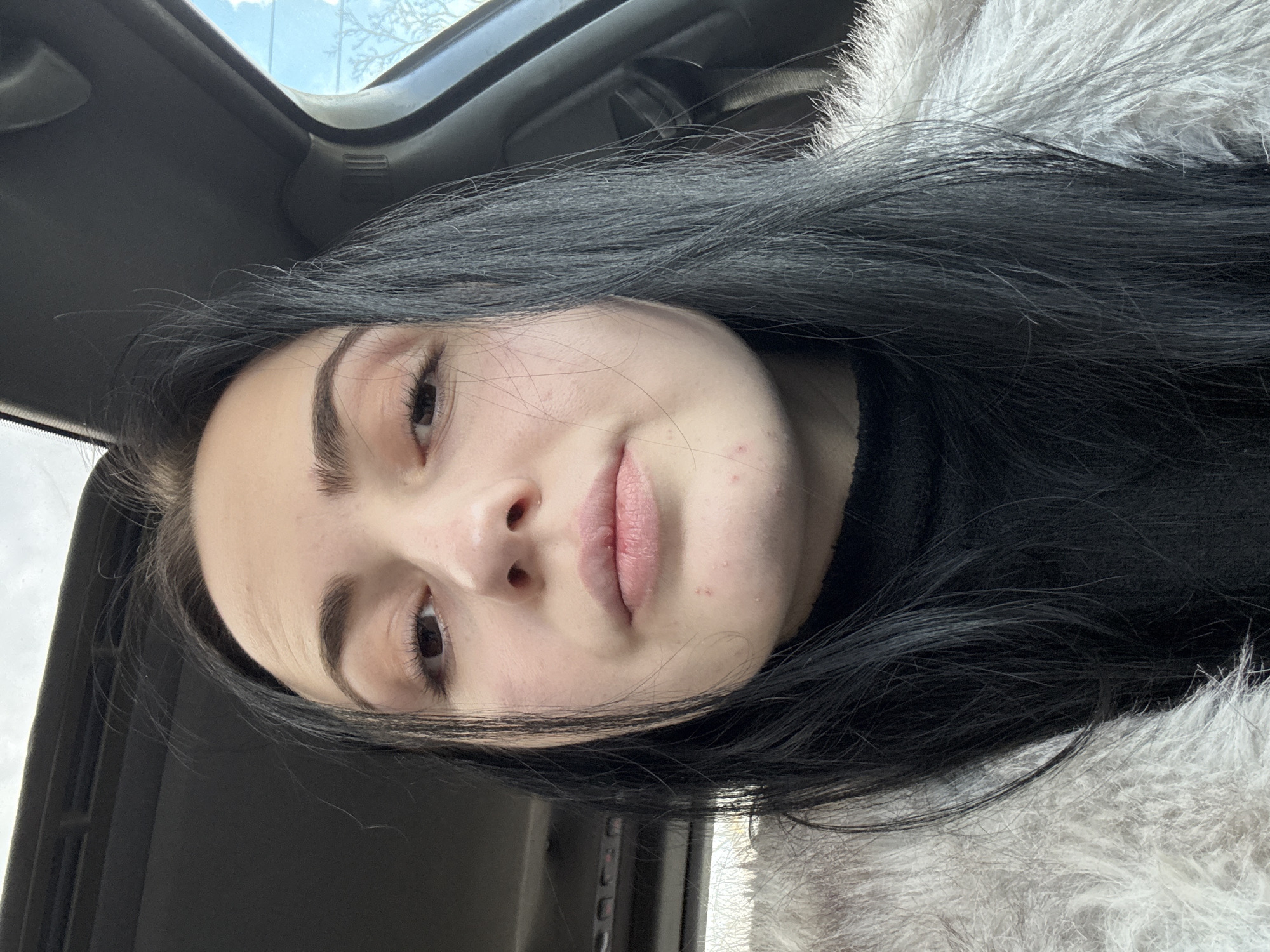 A medium close-up, front-facing photograph depicts a young female subject situated inside the passenger compartment of a vehicle. The subject has long, straight, dark hair, parted centrally, cascading over her shoulders. She wears a black high-neck garment, over which a light-colored, possibly off-white, faux fur jacket is visible. Her facial expression is neutral, and her dark eyes are directed forward, towards the camera. Minor blemishes are discernible on her chin and lower cheek area. Her lips are full and slightly parted, displaying minor dryness. The vehicle's interior ceiling, or headliner, appears dark gray or black, encompassing the upper portion of the frame. To the subject's right, through a vehicle window, a clear blue sky with some white clouds is visible, along with the distinct silhouettes of bare tree branches, indicating a non-foliage season. The vehicle's interior A-pillar trim is visible on the far right. The background to the subject's left is indistinct and blurred. No specific landmarks or architectural features are present within the image to identify a precise location within the city of Yambol, Bulgaria.