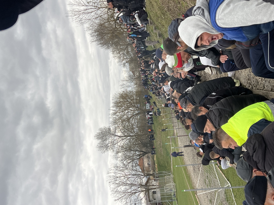 The image presents an outdoor scene in Koprivlen, Bulgaria, under a heavily overcast sky. A large crowd of predominantly adult males is gathered, positioned on a sloped concrete or dirt embankment serving as spectator seating. Individuals are dressed in various casual attire, including jackets, hoodies, and hats, suitable for cool weather. In the foreground, a man wearing a grey hooded sweatshirt and blue vest has his mouth open, indicative of shouting or cheering. Another man in the lower left wears a bright neon yellow-green high-visibility vest. The crowd extends into the midground and background, with additional spectators visible on a grassy bank beyond a fence. To the left, a green football (soccer) field is partially visible, featuring a white goal net and green boundary markers. A single individual in a dark blue uniform stands near the goal net on the field. In the far background, bare trees line the horizon, interspersed with some distant buildings and faint outlines of vehicles.