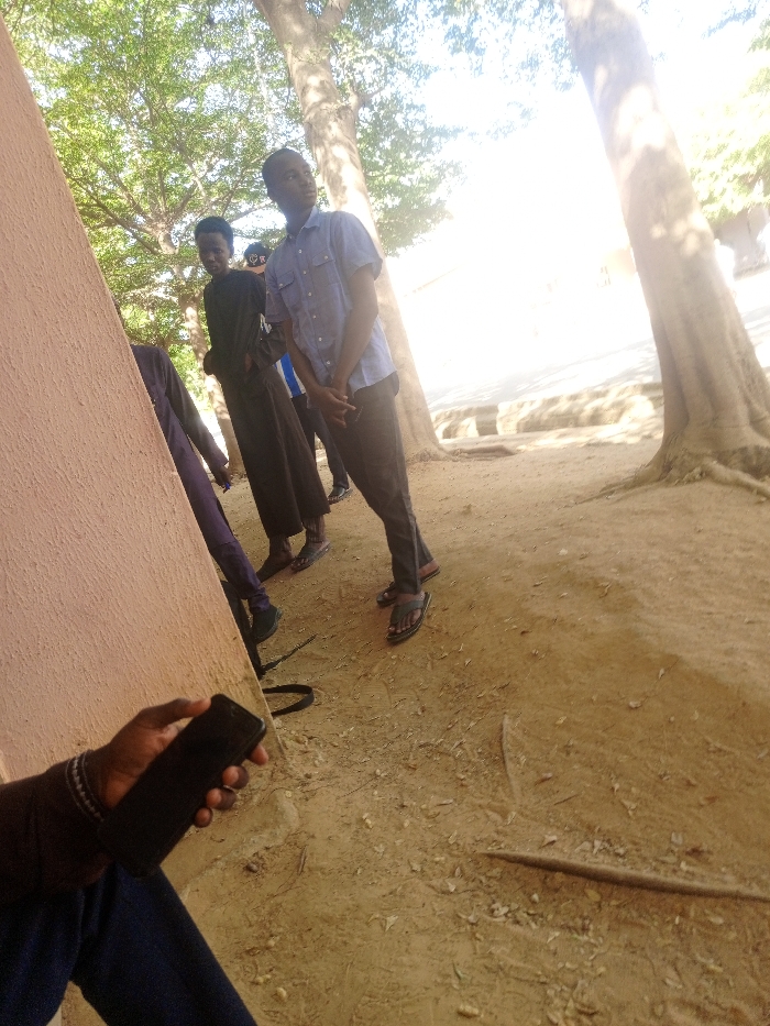 This image captures an outdoor scene in Dabawa, Nigeria, featuring multiple individuals and natural elements under bright daylight
