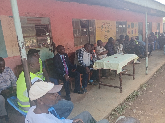 The scene depicts an outdoor gathering in Idakho Central ward, Kenya, along the verandah of a single-story building