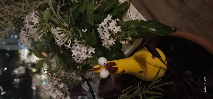 The image displays a novelty chicken toy situated within a potted plant arrangement, likely on a balcony or terrace in Ramat Gan, Israel. The primary subject is a yellow, stylized chicken figure with large white googly eyes, a red comb, and dark brown polka dots on its body. This figure is positioned slightly to the left of the image center, nestled among green foliage and clusters of small white flowers, possibly Pentas. A segment of a brown terracotta-style plant pot is visible in the lower left and bottom-center. The background is dark and out of focus, exhibiting blurred urban lights, indicating a nighttime setting. No individuals are present. The lower-left corner includes the text "Rosa M. Heja."