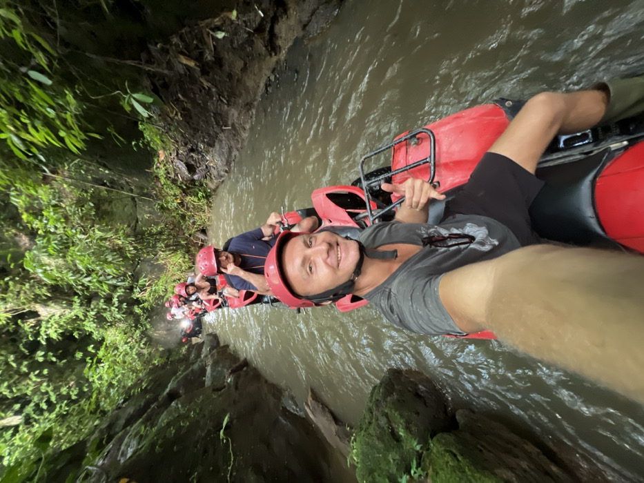 A group of people ride red ATVs through a narrow river channel. Lush green vegetation flanks one side, while a steep bank appears on the other. A smiling man in a red helmet takes a selfie, giving a peace sign. He's wearing a gray t-shirt and black shorts. The muddy water suggests a recent rain. The group is following each other closely, navigating the river's course.