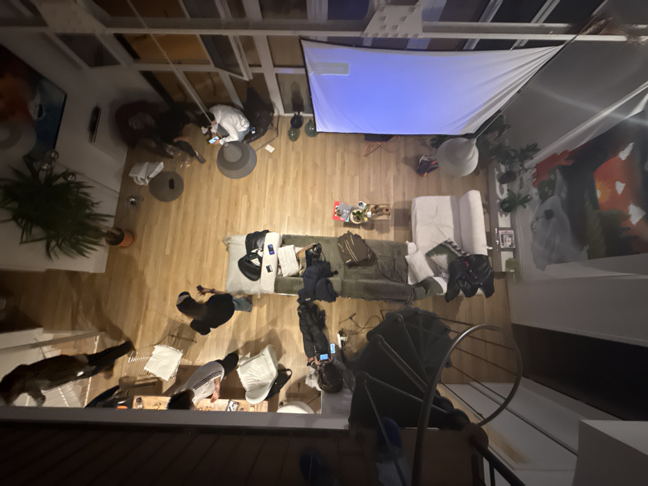 An overhead view captures a multi-level interior space in Saint-Denis, France, illuminated by artificial light. The wooden floor serves as the primary surface. Six individuals are visible: one in dark clothing is in motion in the upper left; a second in a striped white top stands mid-left; a third, in a dark top, stands near a central green upholstered sofa, viewing a mobile phone. A fourth individual is seated at a dark circular table on the right, operating a mobile phone, with a grey fedora hat nearby. A fifth person is partially obscured near a dark metal spiral staircase on the left, with a mobile device visible. A sixth person is seated in the upper right, largely obscured by other objects. The central green upholstered sofa is covered with scattered dark clothing, a black helmet, and a brown shoulder bag. A smaller white sofa or bench is positioned near the bottom center, with black boots on the floor nearby. A white portable projector screen, emitting a light blue luminescence, stands vertically against the wall on the far right. A large potted plant in an orange pot is located in the upper central area, and abstract artworks adorn the walls. Multiple circular tables, scattered items including additional clothing, cables, bottles, and various containers are distributed throughout the scene. The overall arrangement suggests a casual gathering or event preparation.